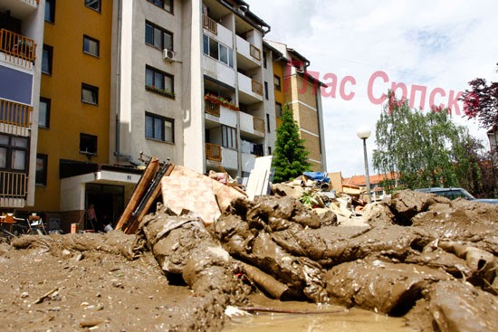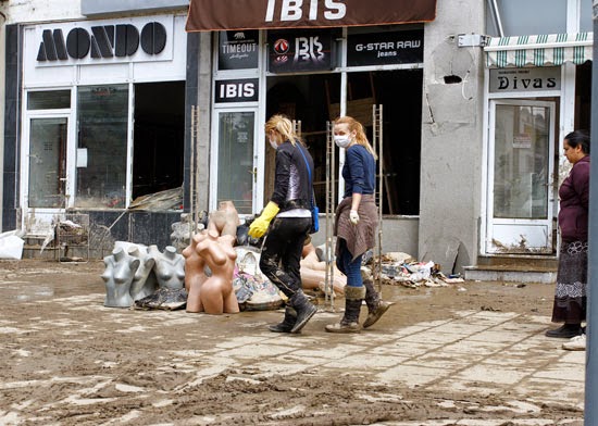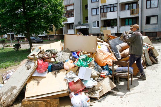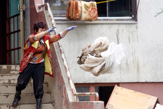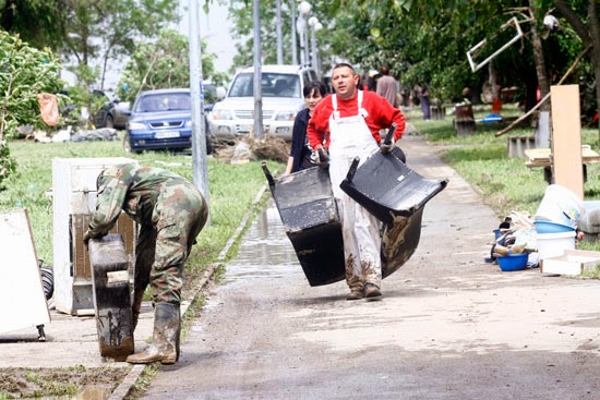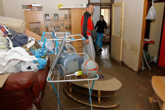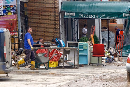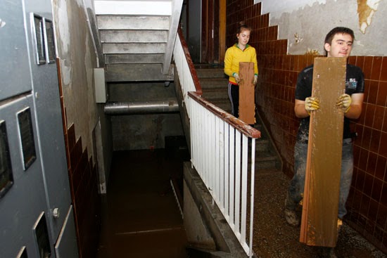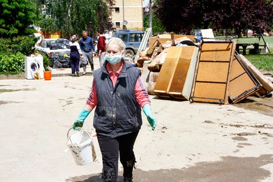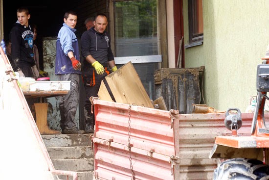 ljudi užurbano kantama izlijevaju vodu iz uništenih domova i uz pomoć komšija iznose